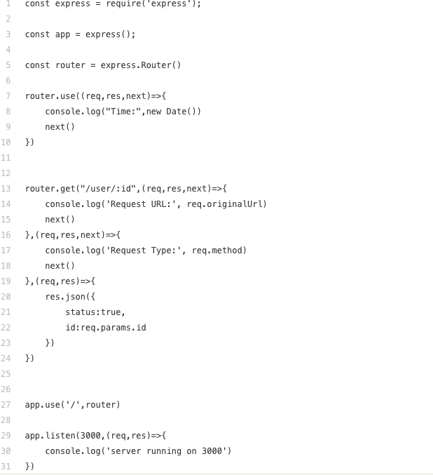 | Routing Middleware | In Express, usually, we make end-points that uses HTTP verbs to denote a GET POST DELETE PUT etc requests. Router is used to manage these incoming requests. It kind of routes your requests to correct handler/code |